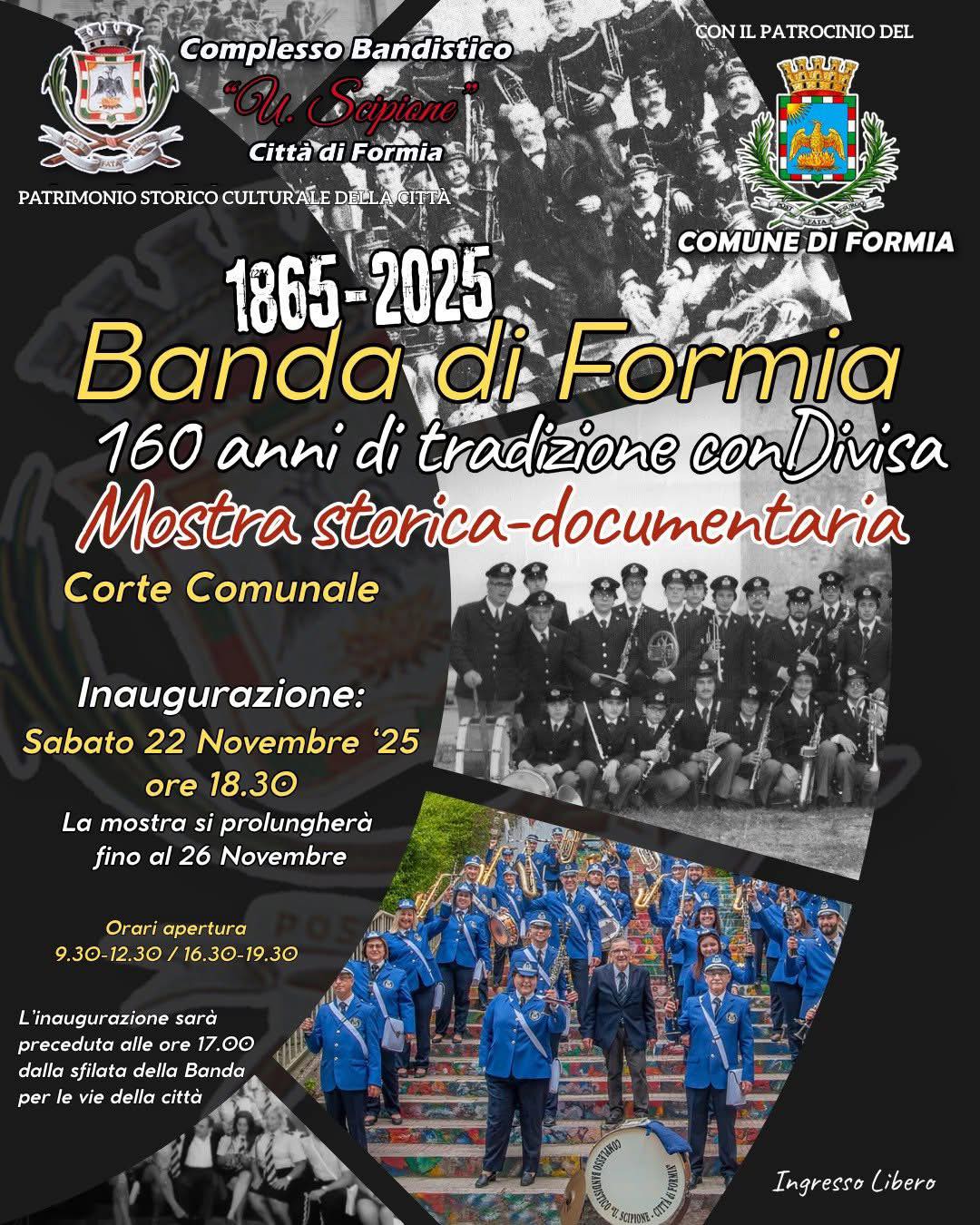 In occasione di questo significativo anniversario, verrà inaugurata una Mostra storico- documentaria, aperta fino al 26 novembre (09.30-12.30 e 16.30-19.30), dedicata alla storia della Banda, con l’esposizione di strumenti, fotografie, documenti d’archivio e divise storiche. L’iniziativa è realizzata con il patrocinio del Comune di Formia. “Festeggiare 160 anni significa onorare non solo la musica, ma il profondo legame tra la Banda e la nostra città – dichiara il M° Filippo Di Maio – Una storia costruita attraverso