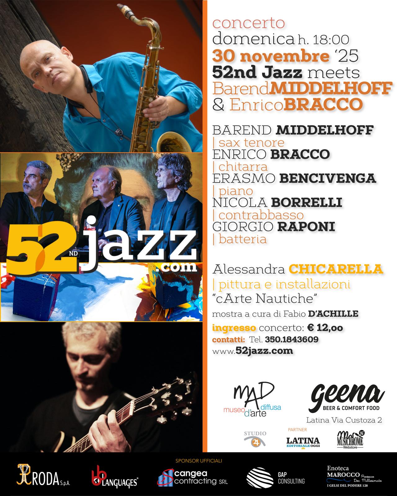 Il concerto sarà accompagnato dalla mostra “cArte Nautiche” di Alessandra Chicarella, inaugurata la settimana scorsa negli spazi del Geena. Un percorso visivo che rilegge mappe e rotte immaginarie per trasformarle in territori interiori, approdi emotivi e geografie astratte. Le opere dialogano con la dimensione musicale del 52nd Jazz, amplificando l’esperienza del pubblico attraverso un intreccio di sguardi, forme e suggestioni.