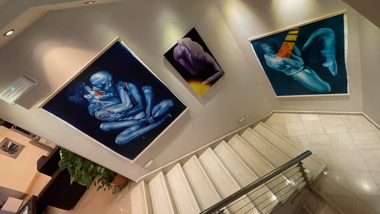 Invece l’approccio di Fabiana Tornesi è più intimo, dicevamo bitonale ma colorato, estetico e di un realismo a dimensione personale, concentrato su corpi potenti prevalentemente femminili in cerca di una posizione in grado di sopportare un peso o di condividere passione e tenerezza. Lei stessa così si descrive: “Cosa succede quando ci si sente persi nel proprio corpo? Quando questo diventa la prigione della propria anima? Sono queste le questioni su cui mi interrogo principalmente. Il corpo rappresenta il limite, ma diventa il principale mezzo espressivo della mia ricerca artistica insieme al colore”.
