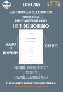 Si terrà sabato 15 novembre alle ore 17.30 presso la Casa del Combattente di Latina, la presentazione del libro – in anteprima nazionale – “I miti del Sionismo”, scritto dal prof. Claudio Mutti e edito dalle Edizioni di Ar. Ad organizzare l’evento è l’associazione culturale Identità e Territorio. Il testo trae origine da una conferenza organizzata dallo stesso sodalizio, esattamente un anno addietro proprio nel capoluogo pontino. La conferenza è visibile integralmente sul canale Youtube di Identità e Territorio, e vista l’importanza del tema, la valenza del relatore e l’indubbia utilità delle tesi enunciate, è stata tramutata in un libro per aumentarne la diffusione. Per partecipare si raccomanda di effettuare l’accredito all’indirizzo email: info.identitaterritorio@gmail.com A presentare il testo sarà Emanuele Campilongo – autore della nota introduttiva – coadiuvato da Daniele Ippoliti. Sono previste numerose presentazioni a partire da questo appuntamento, che porteranno quest’opera prima in giro per il Lazio e a partire dal prossimo anno, praticamente in tutta Italia. Visto la particolare genesi non si poteva non iniziare il tour proprio dove tutto è nato cioè Latina. Il prof. Mutti è riuscito, attraverso l’analisi e le tesi proposte in numerosi testi di autori ebraici o comunque non ostili allo Stato d’Israele, ad effettuare una esposizione che chiarisce e mira a superare gli stereotipi e le “appropriazioni indebite”, sia dal punto di vista semantico che fattuale. Questa iniziativa editoriale e culturale, mira a riportare il dibattito sul conflitto legato all’occupazione della Palestina, ad un grado di chiarezza e di linearità – su alcuni aspetti basilari – sui quali si fa molta fatica ad eliminare dei preconcetti ideologici che non fanno altro che rendere un servizio a chi vuole giustificare lo status quo. Mutti è andato alle origini, utilizzando fonti solide e affermate, è riuscito nell’intento di dimostrare come gli accadimenti tragici di cui tanto abbiamo discusso in questi mesi, non siano frutto esclusivamente della follia di uno o più gruppi dirigenti, ma abbiano radici ben più profonde e pericolose.