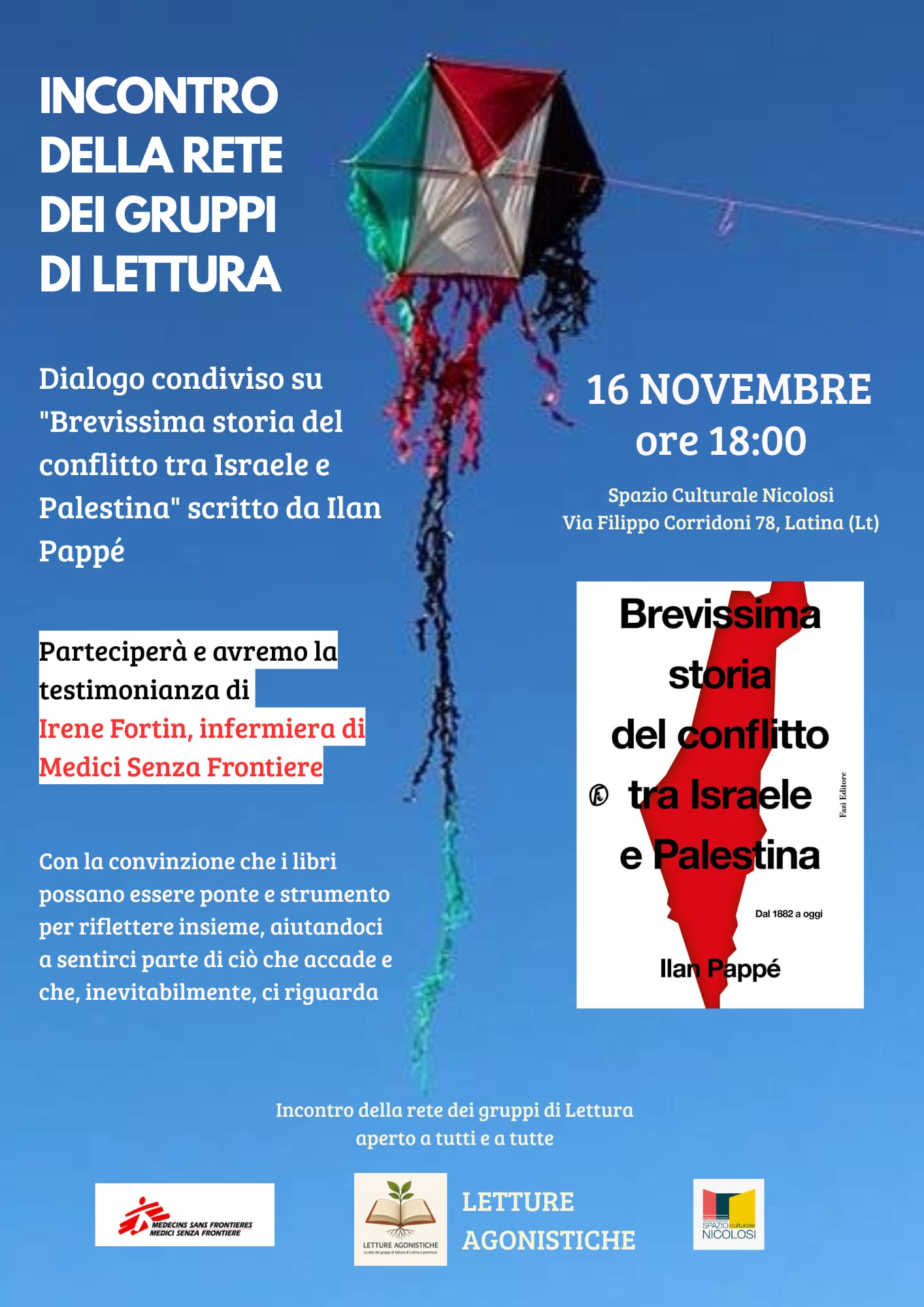 Domenica 16 novembre 2025, alle ore 18:00, lo Spazio Culturale Nicolosi di Latina (Via Filippo Corridoni 78) ospiterà l’Incontro della Rete dei Gruppi di Lettura, un evento di riflessione condivisa che partirà dal libro “Brevissima storia del conflitto tra Israele e Palestina” di Ilan Pappé (Fazi editore). L’incontro, promosso da Letture Agonistiche – La Rete dei Gruppi di Lettura di Latina e Provincia, in collaborazione con Medici Senza Frontiere e lo Spazio Culturale Nicolosi, rappresenterà un’occasione di approfondimento su uno dei conflitti più complessi della storia contemporanea.