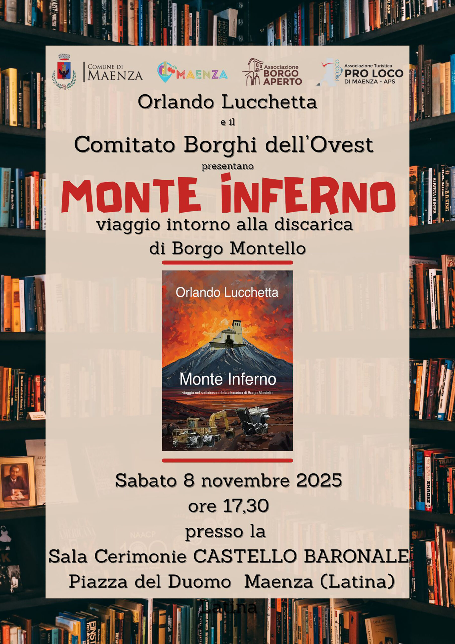 L’iniziativa di Maenza, per la presentazione del libro Monte Inferno, nasce da un pensiero affettuoso di Giovanni Bizzarri e Luca Morazzano, con il Patrocinio del Comune di Maenza, della Pro Loco e dall’Associazione Borgo Aperto. Sarà un incontro dedicato non solo al libro, ma anche al ricordo di due uomini giusti: Umberto Cacciotti ed Eldo Riccardi.
