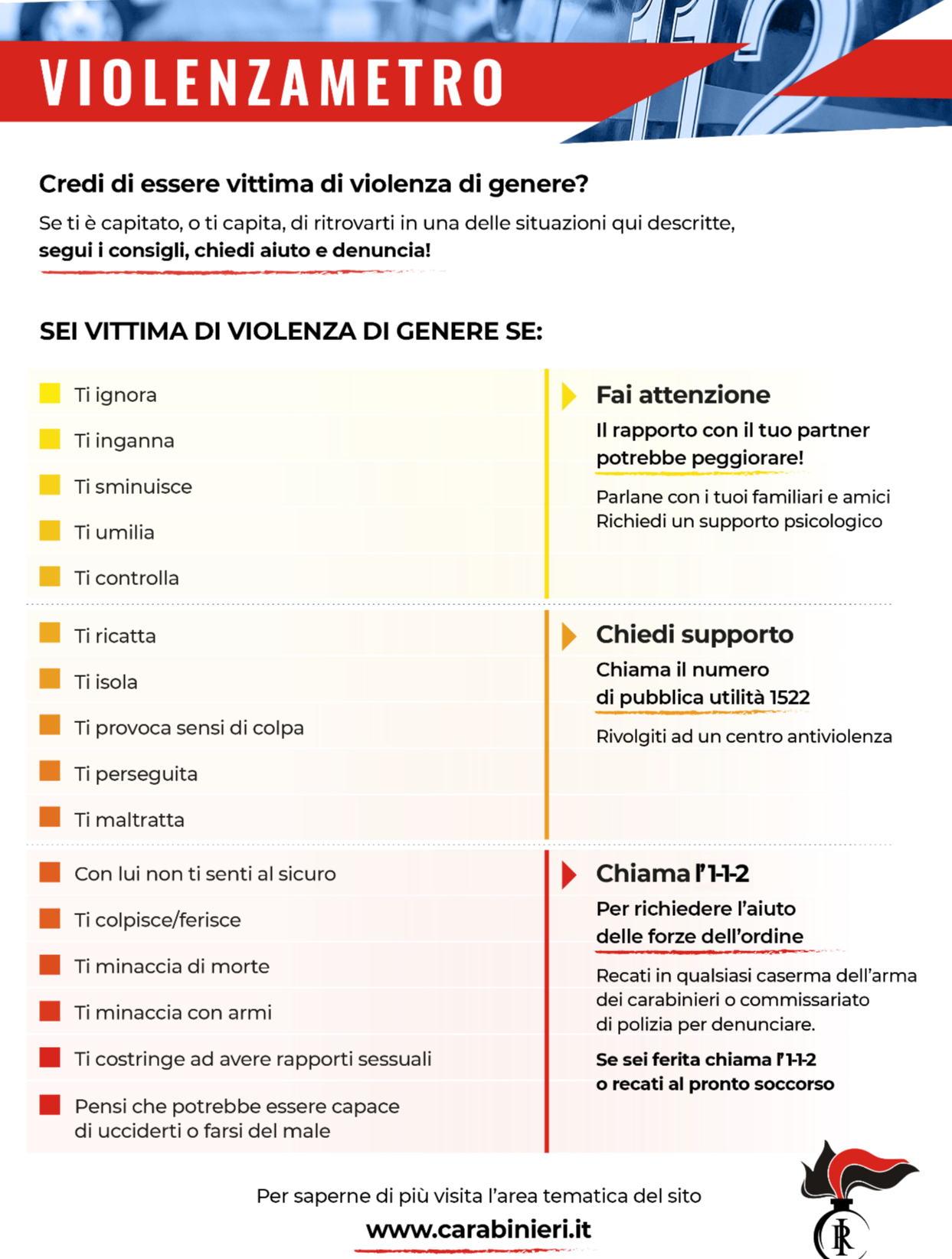 In occasione del 25 novembre, “Giornata internazionale per l’eliminazione della violenza contro le donne”, l’Arma dei Carabinieri ha organizzato una campagna di comunicazione e responsabilizzazione che mira a rafforzare la consapevolezza e l’impegno sul delicato tema. Ogni giorno, l’Istituzione è in prima linea nella lotta alla violenza contro le donne e le iniziative intraprese sono tutte accomunate dal dire fermamente “No!” a qualsiasi forma di comportamento violento o discriminante – sia fisico che psicologico. La diffusione di materiale informativo, di locandine e video sui principali canali social dell’Arma, oltre alle numerose interviste di Carabinieri particolarmente impegnati nella specifica attività, rappresentano strumenti utili a incoraggiare le vittime affinché denuncino ciò che subiscono. In tale prospettiva, è stato realizzato uno spot con la partecipazione dell’attrice Cristiana Capotondi, che richiama i concetti di rispetto, ascolto e legalità, sottolineando la necessità di investire su un cambiamento culturale per un futuro senza violenza. A tal fine, prosegue il coinvolgimento delle scuole e delle comunità. In molti Comuni i Carabinieri hanno organizzato incontri informativi per sensibilizzare i giovani sul delicato tema e per promuovere una rinnovata concezione della donna, che ne rispetti la dignità, valorizzandone le risorse, così superando in definitiva quel retaggio culturale che l’ha vista storicamente in posizione di disuguaglianza. Anche quest’anno, tante caserme dell’Arma si illumineranno di arancione, in adesione alla campagna internazionale “Orange the World”, come segno concreto dell’importante impegno profuso dall’Istituzione. Inoltre, sul sito www.carabinieri.it, è stata dedicata un’intera sezione al “Codice Rosso”, che offre informazioni sul fenomeno e sugli strumenti di tutela delle vittime, mettendo a disposizione un test di autovalutazione, denominato “Violenzametro”, che rileva il livello di violenza subita in un rapporto di coppia (http://www.carabinieri.it/in-vostro-aiuto/consigli/codice-rosso/codice-rosso). Il fenomeno della violenza di genere resta una delle priorità operative dell’Arma, che – in un quadro normativo e sociale in continua evoluzione – ha sviluppato nel tempo una serie articolata di progetti e strutture finalizzate alla prevenzione, all’ascolto e al contrasto. Nel 2009 è stata istituita la Sezione Atti Persecutori, collocata nell’ambito del Reparto Analisi Criminologiche (R.A.C.) del Raggruppamento Carabinieri Investigazioni Scientifiche (Ra.C.I.S.), per svolgere studi e analisi del fenomeno e delineare strategie di prevenzione e di contrasto aggiornate edefficaci. La Sezione, che si compone di personale con peculiari competenze scientifiche e psicologiche – cui si affiancano anche investigatori con esperienza maturata direttamente sul campo, viene tempestivamente informata di ogni evento significativo che accade sull’intero territorio nazionale per approfondire gli aspetti psico-criminologici e contribuire all’analisi dei fattori di rischio e alla definizione di strategie operative. A partire dal 2014, l’Arma si è dotata di una “Rete nazionale di monitoraggio sul fenomeno della violenza di genere”, costituita da ufficiali di polizia giudiziaria (Marescialli e Brigadieri) con formazione certificata nel settore. Essi fungono da punti di riferimento per i Reparti sul territorio nello sviluppo delle indagini e rappresentano l’elemento di raccordo con la Sezione Atti Persecutori per un più compiuto apprezzamento dei casi.