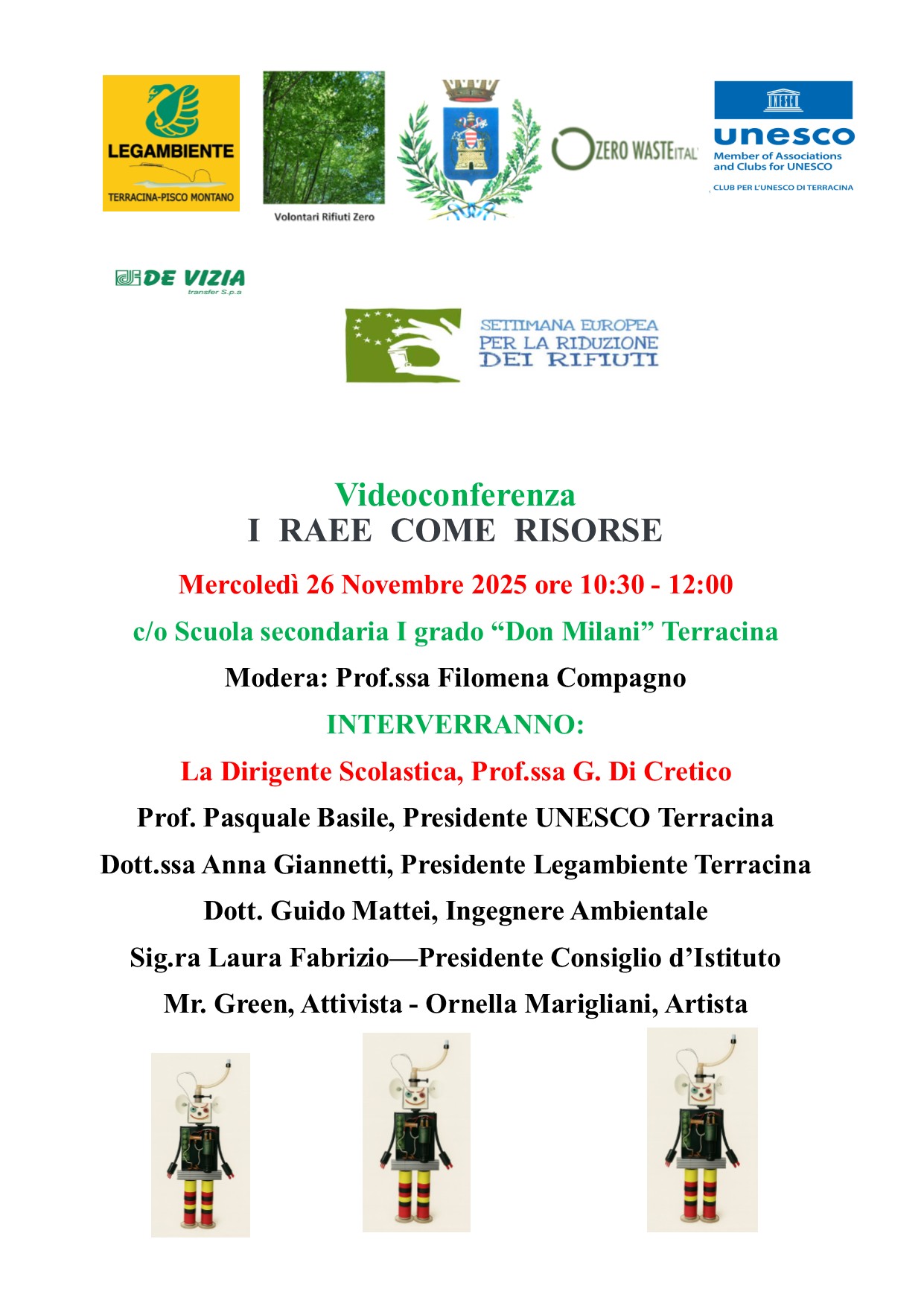 Anche quest’anno l’Istituto Comprensivo “Milani” Terracina con una rete di scuole coordinata dalla Prof.ssa Filomena Compagno partecipa alla SERR (Settimana Europea per la Riduzione dei Rifiuti) con un’azione dal titolo emblematico: “Caccia al tesoro di RAEE”. Il tema sono i RAEE (Rifiuti di Apparecchiature Elettriche ed Elettroniche), su cui Mercoledì 26 Novembre si è svolta la videoconferenza nei locali della Scuola Secondaria “Don Lorenzo Milani”.