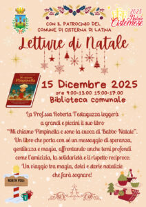 La Biblioteca Comunale di Cisterna si prepara ad accogliere un ospite davvero speciale: la Cuoca di Babbo Natale, protagonista della nuova opera scritta dalla professoressa Roberta Testaguzza, insignita dell’onorificenza di Cavaliere dell’Ordine al Merito della Repubblica Italiana.