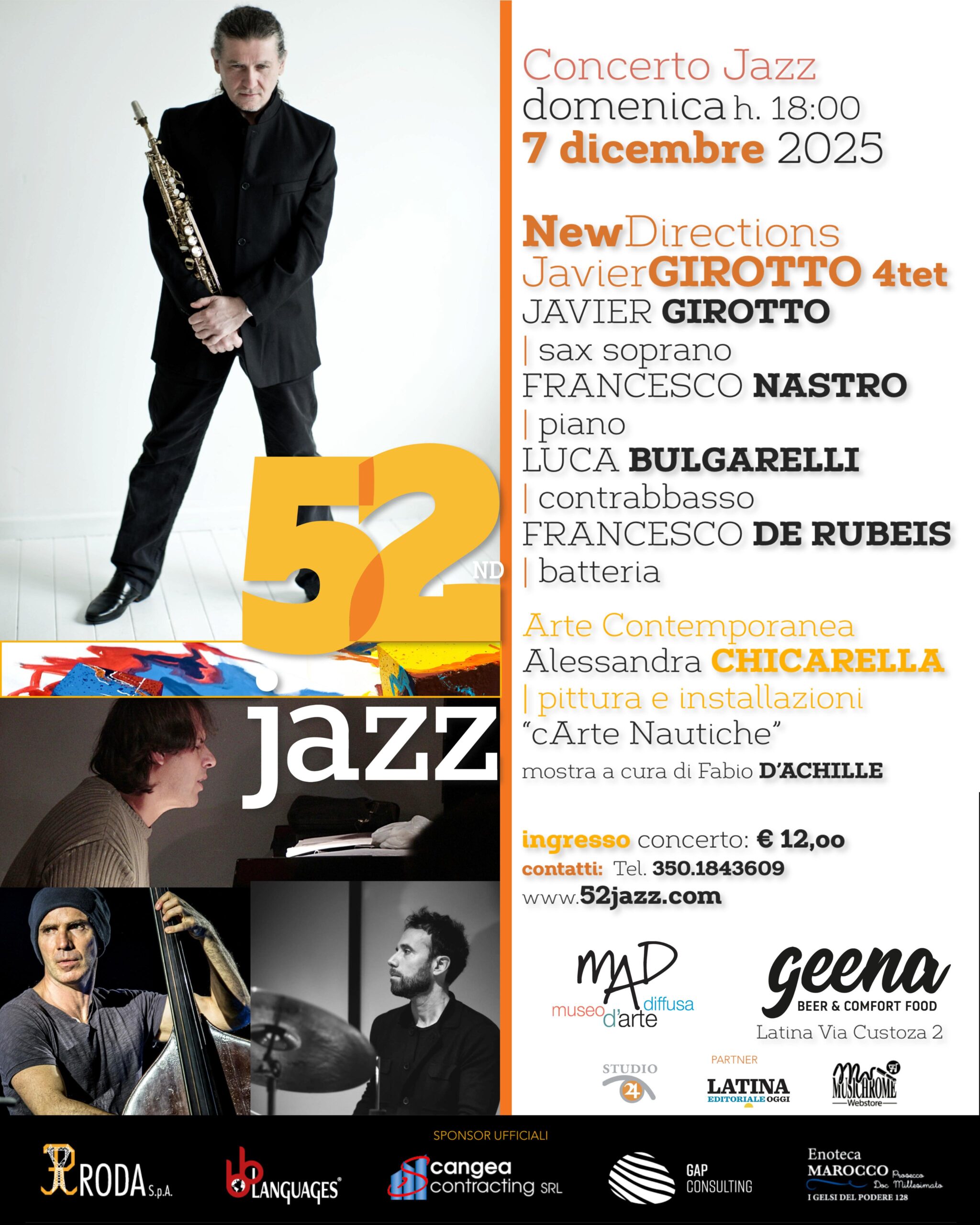 Domenica 7 dicembre, alle ore 18.00, il 52nd Jazz porta sul palco del Geena (Latina) il New Directions Quartet guidato da Javier Girotto, una delle voci più riconoscibili del sax contemporaneo, capace di intrecciare le radici sudamericane con il jazz europeo e la tradizione afroamericana. Tra nuove scritture, improvvisazione e una mostra d’arte che dialoga con la musica.