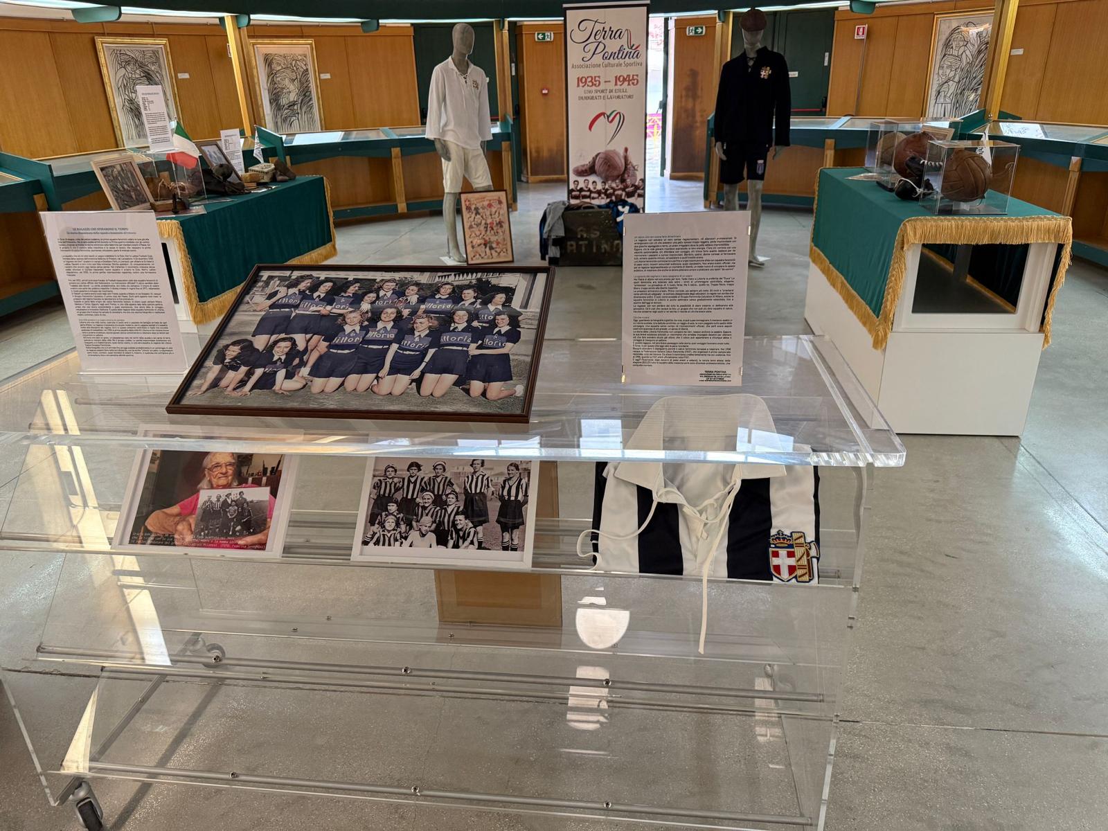 L’esposizione è inserita nel percorso artistico dal titolo “Donne e Sport, dentro e fuori dai cinque cerchi olimpici”: un progetto realizzato dal Comune in collaborazione con il Panathlon International Club di Latina, che racconta talento, storia e valori dello sport al femminile ed è pensato proprio per valorizzare la figura della donna e i risultati raggiunti dentro e fuori dal campo sportivo. L’associazione culturale sportiva Terra Pontina per la prima volta a Latina presenta una sezione dedicata esclusivamente al territorio, insieme a una selezione di preziosi cimeli sportivi raccolti negli ultimi anni di ricerca. Tra questi spiccano le prime scarpe da calcio per bambini, la storia della prima squadra femminile di calcio in Italia è quella delle ginnaste della città di Littoria e il “Seminatore d’Oro” per il campionato 77/78, ricevuto dall’allenatore del Latina Leonardi.