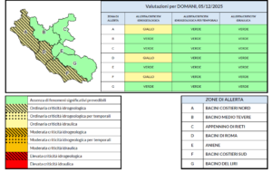 “Tenuto conto altresì delle caratteristiche spazio-temporali delle precipitazioni previste e della loro intensità – prosegue – dello stato di saturazione dei suoli e dei livelli dei corsi d’acqua, nonché delle indicazioni rese disponibili dai presidi territoriali e dalla modellistica idrologica ed idraulica, della suddivisione del territorio regionale in Zone di Allerta, il Centro Funzionale Regionale ha effettuato la valutazione dei Livelli di Allerta/Criticità, riportata nelle seguenti tabelle, con validità dal prime ore di domani, 05/12/2025 e per le successive 12 ore”.
