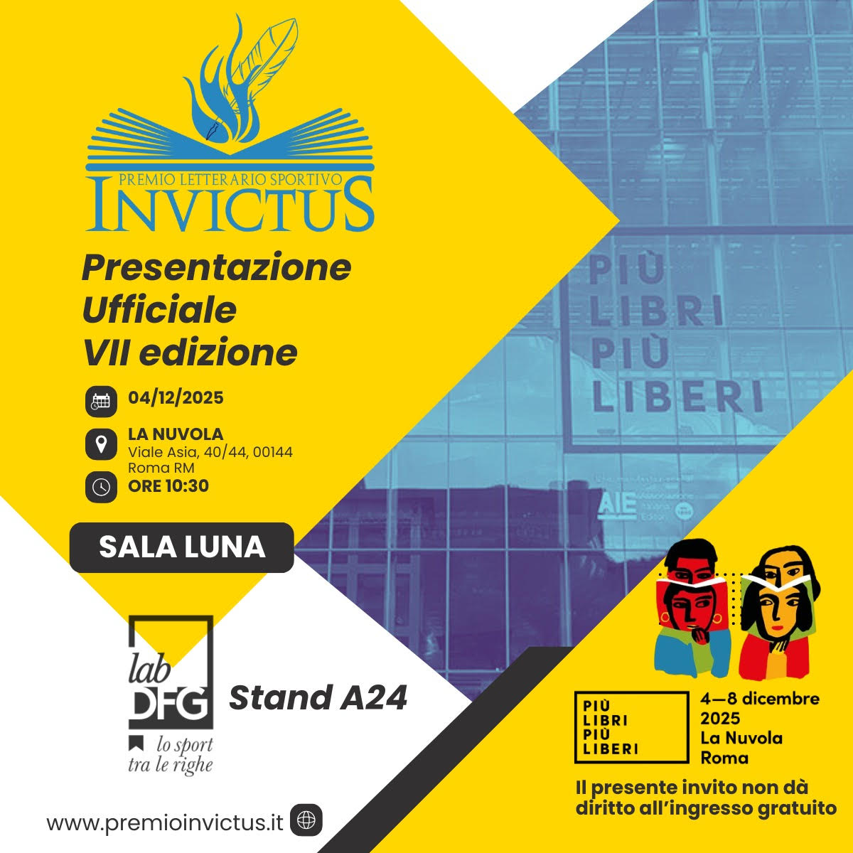 La tradizione si rinnova. Giovedì 4 dicembre, per il quarto anno consecutivo, alla “Nuvola di Fuksas” di Roma, in occasione di Più Libri più Liberi, la Fiera Nazionale della Piccola e Media Editoria, sarà presentata la settima edizione del Premio Letterario Sportivo Invictus, iniziativa ideata e realizzata dalla casa editrice Lab DFG. Alla presentazione, che si svolgerà alle ore 10.30 nella Sala Luna, saranno presenti i testimonial sportivi Emanuele Blandamura, campione di pugilato, l’astro nascente dell’atletica italiana, la lanciatrice Benedetta Benedetti e l’Ambassador del Premio Luca Pancalli.