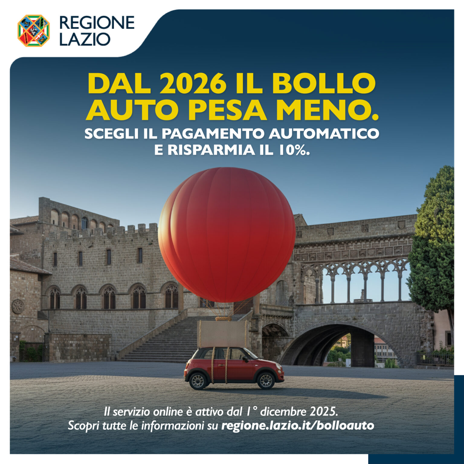 Per promuovere l’iniziativa, la Regione Lazio ha lanciato la campagna “Dal 2026 il bollo auto pesa meno, scegli il pagamento automatico e risparmia il 10%”.