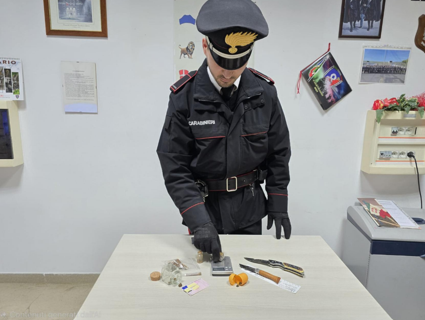 La perquisizione è poi proseguita nella sua abitazione, dove i Carabinieri hanno rinvenuto altra droga, tra hashish e marijuana, oltre a due coltelli con lame di 11 e 7 centimetri.