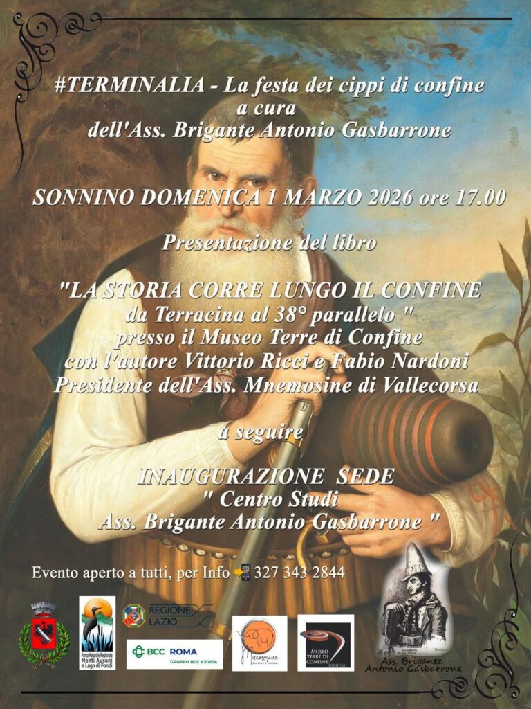 Inaugurazione della nuova sede del Centro Studi “Ass. Brigante Antonio Gasbarrone”: presso lo storico Palazzo Mancini, adiacente al museo, messo a disposizione dall’amministrazione comunale di Sonnino, con il sostegno del sindaco Gianni Carroccia. Il centro studi sarà un luogo d’incontro per collaboratori, ricercatori, studenti e appassionati di storia del brigantaggio e della figura di Antonio Gasbarrone, noto come Gasperone, l’ultimo brigante.