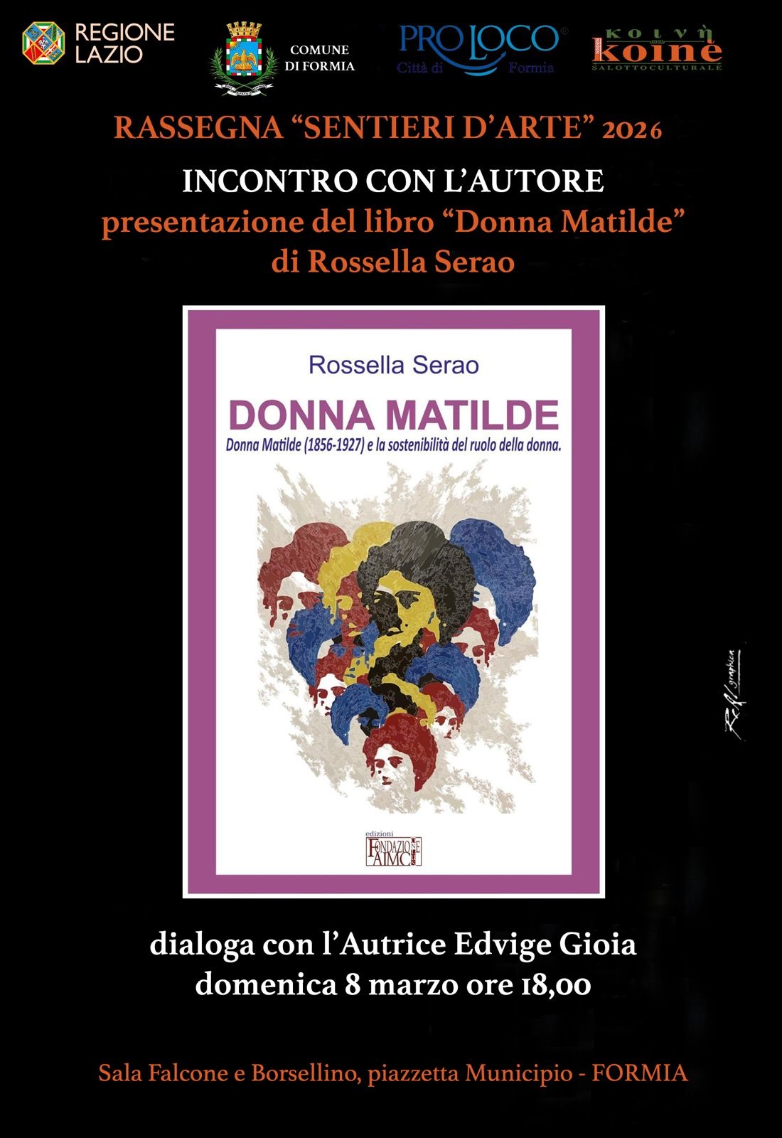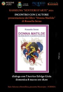 Domenica 8 marzo alle ore 18.00, presso la Sala Falcone e Borsellino del Comune di Formia, nell’ambito della rassegna “Sentieri d’Arte 2026”, per la sezione “Incontro con l’Autore”, si terrà la presentazione del volume “Donna Matilde” (1856-1927) e la sostenibilità del ruolo della donna di Rossella Serao (Fondazione AIMC Onlus, 2023). Il libro propone una riflessione attuale e approfondita sui temi della parità di genere, dello sviluppo sostenibile del ruolo delle donne e dell’equiparazione dei diritti, attraverso la figura della scrittrice e giornalista Matilde Serao. La scelta di dedicare il volume a questa straordinaria protagonista della cultura italiana nasce dal suo ruolo pionieristico: fu infatti la prima donna in Italia a fondare e dirigere importanti quotidiani, tra cui Il Mattino e Il Giorno, dimostrando già agli inizi del Novecento una visione moderna legata all’imprenditorialità femminile e all’empowerment.