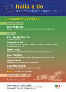 Il Partito Democratico si interroga sul ruolo dell’Unione Europea e dell’Italia sulla sicurezza comune di fronte alle sfide che attendono il nostro continente. A tal fine, ha organizzato un convegno a tema presso la biblioteca comunale “Feliciano Iannella” il 5 Marzo alle ore 17.00. I recenti avvenimenti, infatti, rendono attuale la riflessione organizzata dal Circolo “Anselmi-Iotti” del Partito Democratico di Sabaudia sul tema della difesa comune e le sfide globali che attendono l’Unione Europea e l’Italia. I continui focolai di guerra, da ultimo quello che vede coinvolti gi Usa ed Israele contro l’Iran, spingono ad una riflessione sul termine della sicurezza e del ruolo che l’Unione Europea è chiamata a svolgere sullo scenario internazionale. Un momento importante di confronto al quale interverranno – a seguito del saluto del Segretario del Circolo Luca Mignacca – l’On. Lorenzo Guerini, Presidente del Copasir, l’organismo parlamentare di controllo dei servizi d’informazione e sicurezza della Repubblica; il professore Niccolò Petrelli professore di Studi Strategici presso la facoltà di Scienze Politiche Roma 3 e Mario Leone, membro del comitato federale del movimento federalista europeo. Assieme a loro, il Segretario Provinciale del Partito Democratico Omar Sarubbo, i consiglieri comunali Giancarlo Massimi e Simone Brina. A moderare il dibattito, Gianmarco Massimi.