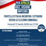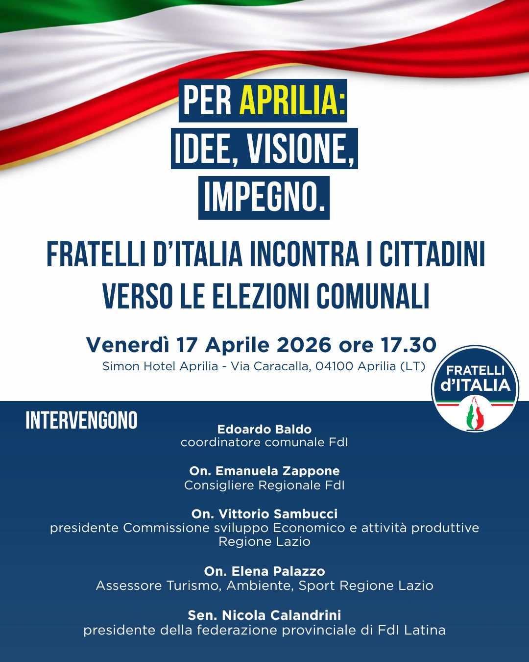 Aprilia si prepara a un importante momento di confronto con i cittadini in vista delle prossime elezioni comunali. Venerdì 17 aprile 2026, alle ore 17.30, presso il Simon Hotel di Aprilia, Fratelli d’Italia promuove un incontro pubblico dal titolo “Per Aprilia: idee, visione, impegno”. L’iniziativa rappresenta un’occasione di dialogo aperto con il territorio, per condividere proposte concrete e ascoltare le esigenze della comunità locale. Ad aprire i lavori sarà il coordinatore comunale di Fratelli d’Italia, Edoardo Baldo, che sottolinea: “Questo appuntamento nasce dalla volontà di costruire insieme ai cittadini un progetto serio per Aprilia, fondato su ascolto, partecipazione e responsabilità. Vogliamo riportare al centro le priorità della città con una visione chiara e concreta”.