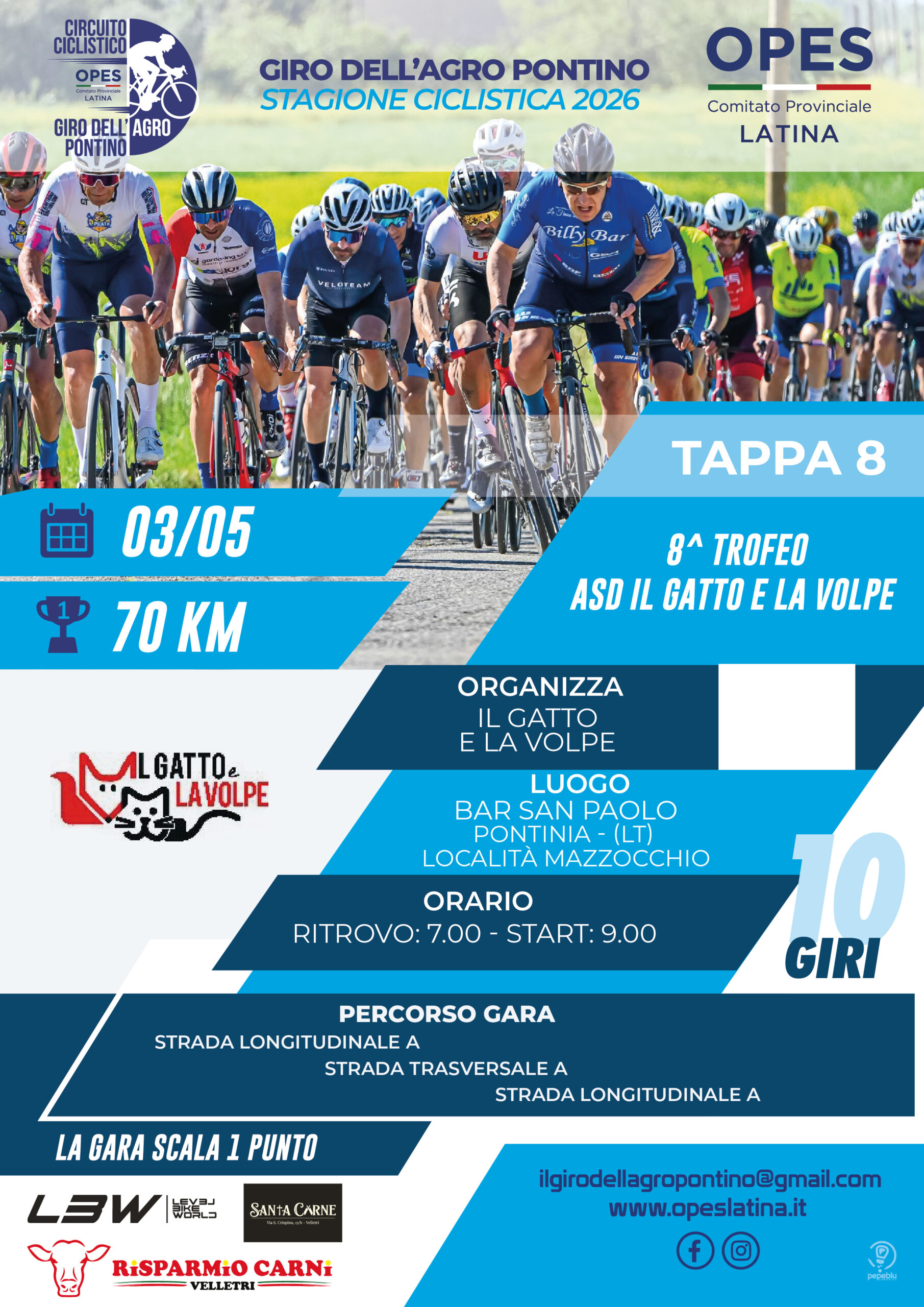 Domenica 3 maggio 2026 andrà in scena l’ottava tappa del Giro dell’Agro Pontino Opes, sotto l’organizzazione della ASD Il Gatto e la Volpe.