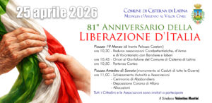 Sabato 25 aprile Cisterna celebra con una cerimonia in piazza l’81esimo anniversario della Liberazione d’Italia, rendendo omaggio a tutti coloro che hanno combattuto per difendere i valori della libertà e della democrazia sacrificando spesso le loro vite in linea con l’importanza storica della ricorrenza e dei valori anti fascisti.