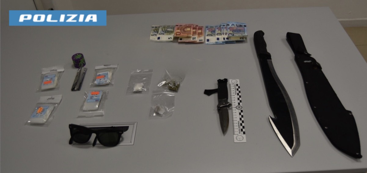 Le successive attività di perquisizione hanno permesso di rinvenire ulteriori quantitativi di droga, nonché materiale per il confezionamento, tra cui bustine in plastica e cartine. Inoltre, all’interno di uno scooter nella sua disponibilità, sono stati rinvenuti e sequestrati un machete della lunghezza complessiva di circa 54 cm e un coltello a serramanico, anch’esso intriso di sostanza stupefacente. Condotto presso gli uffici del Commissariato, il soggetto ha fornito inizialmente false generalità, sconfessate dai successivi accertamenti fotodattiloscopici che hanno consentito di identificarlo con certezza. Informato il Pubblico Ministero di turno presso la Procura della Repubblica di Latina, lo stesso ha disposto la custodia cautelare dell’arrestato presso la locale casa circondariale.