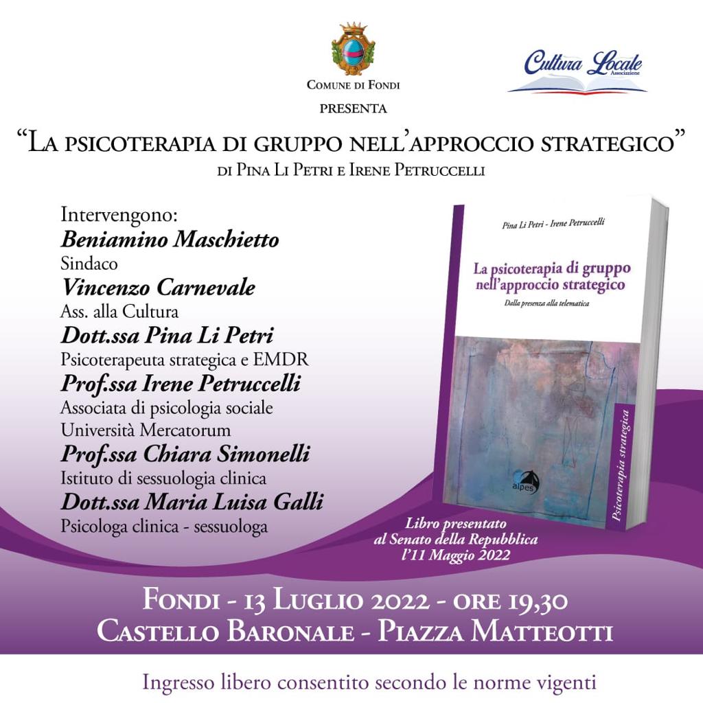 FONDI, “La psicoterapia di gruppo nell’approccio strategico”: mercoledì 13 luglio la presentazione del libro di Pina Li Petri e Irene Petruccelli