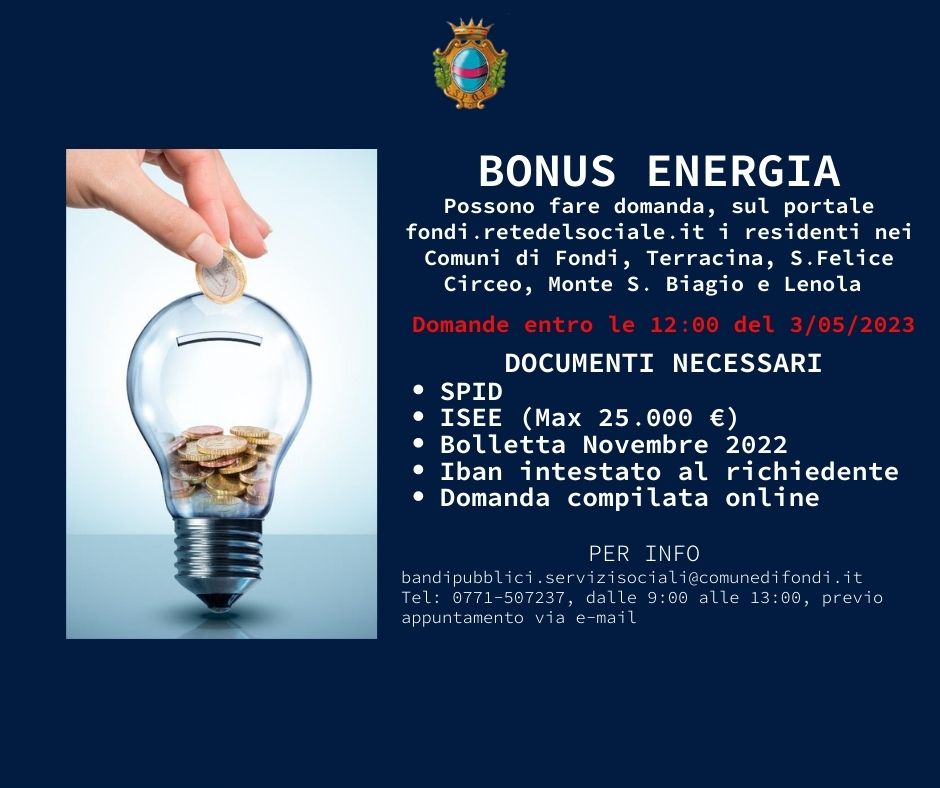 FONDI, bonus energia: 150 euro una tantum alle famiglie con ISEE inferiore a 25mila euro