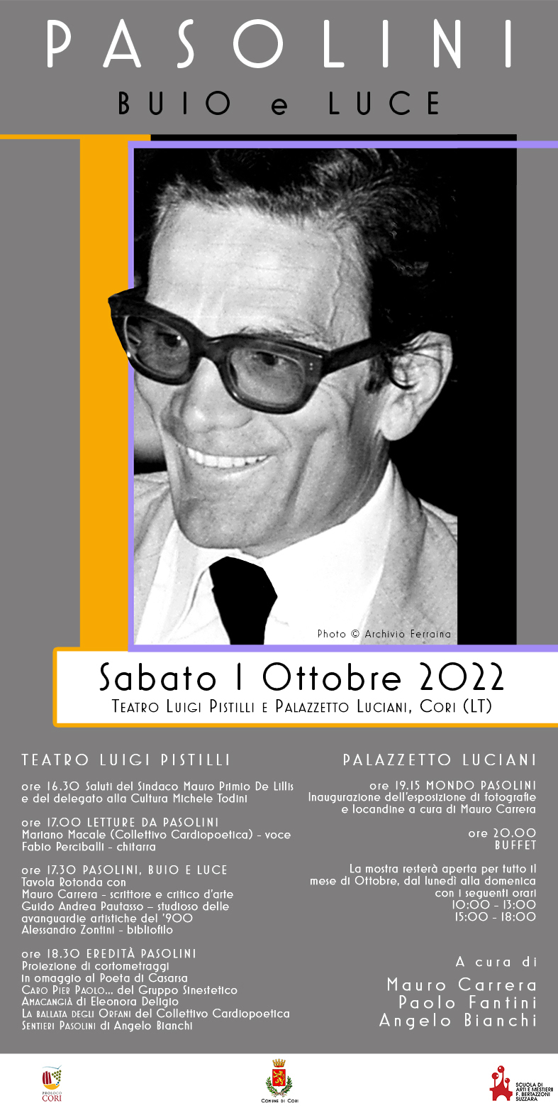 CORI, ‘PASOLINI, BUIO E LUCE’: sabato al teatro Pistilli e a palazzetto Luciani