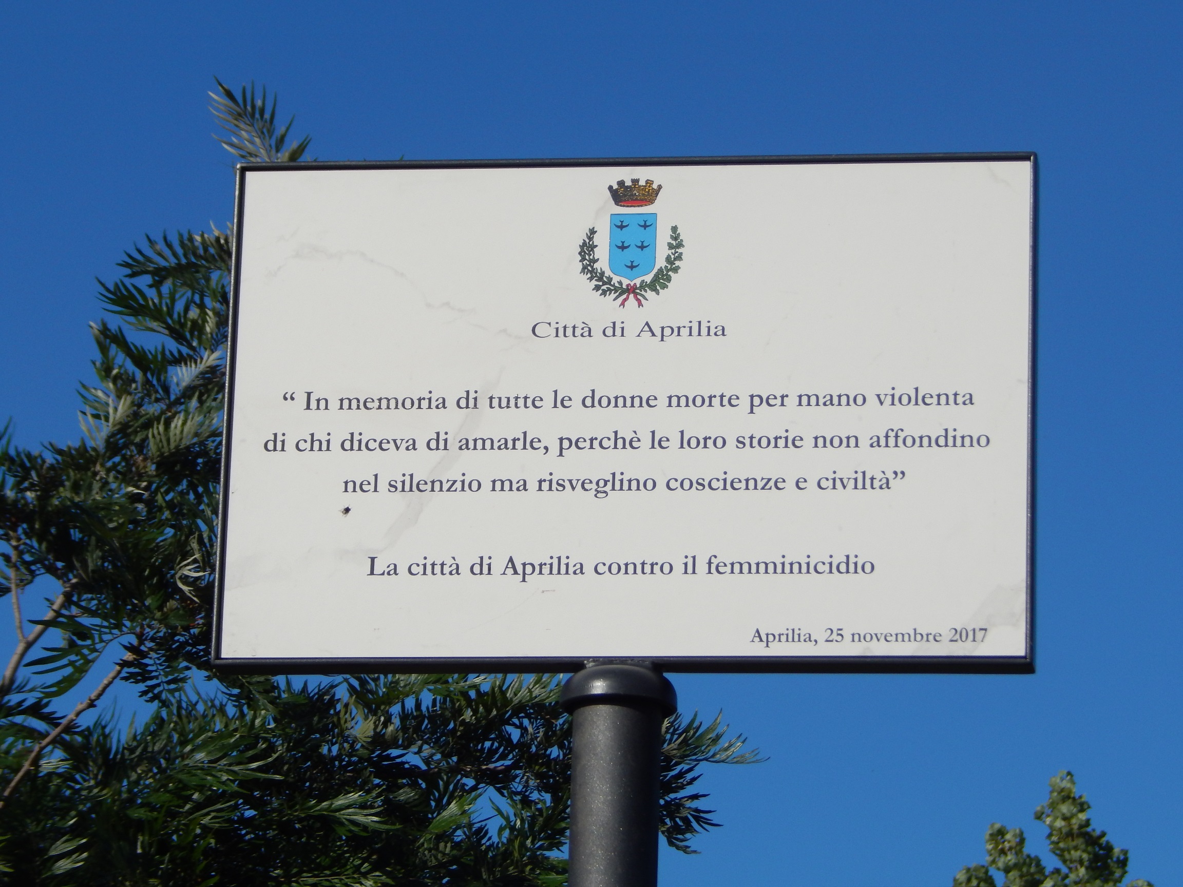 Aprilia, scoperta la targa in memoria di tutte le vittime di femminicidio