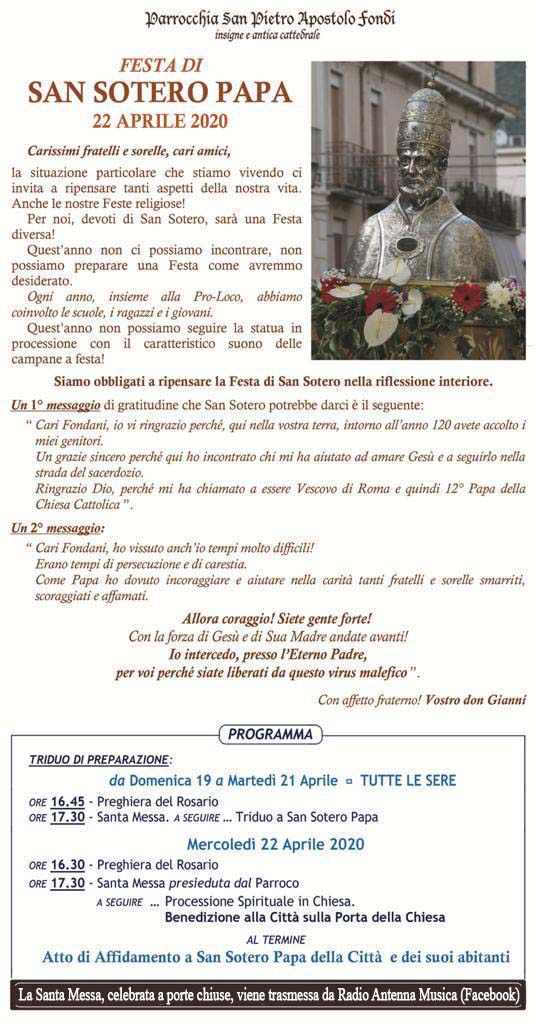 FONDI, la lettera di don Gianni ai fedeli e il programma della festa di San Sotero in streaming