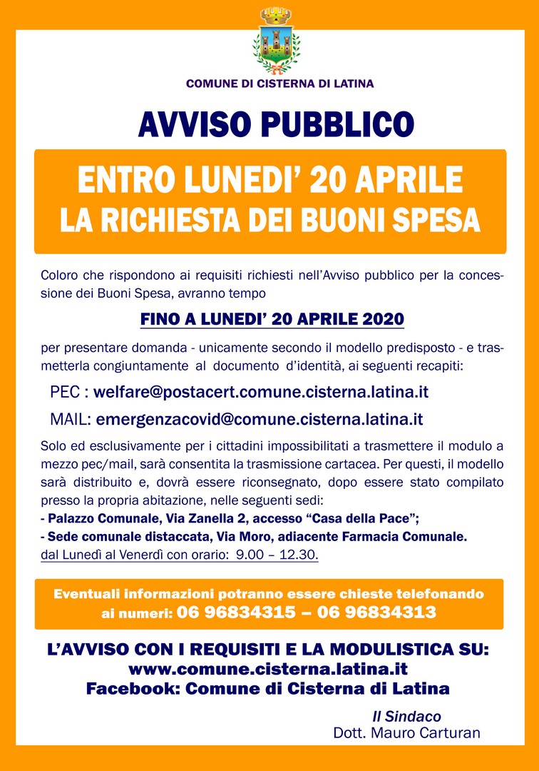 CISTERNA DI LATINA, il 20 aprile termine ultimo per la presentazione delle domande per i buoni spesa
