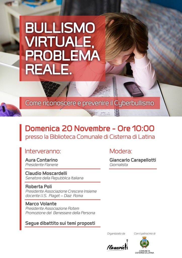 Cisterna, “Bullismo virtuale. Problema reale”: domenica il convegno organizzato dall’associazione “Flanerie” presso la biblioteca comunale