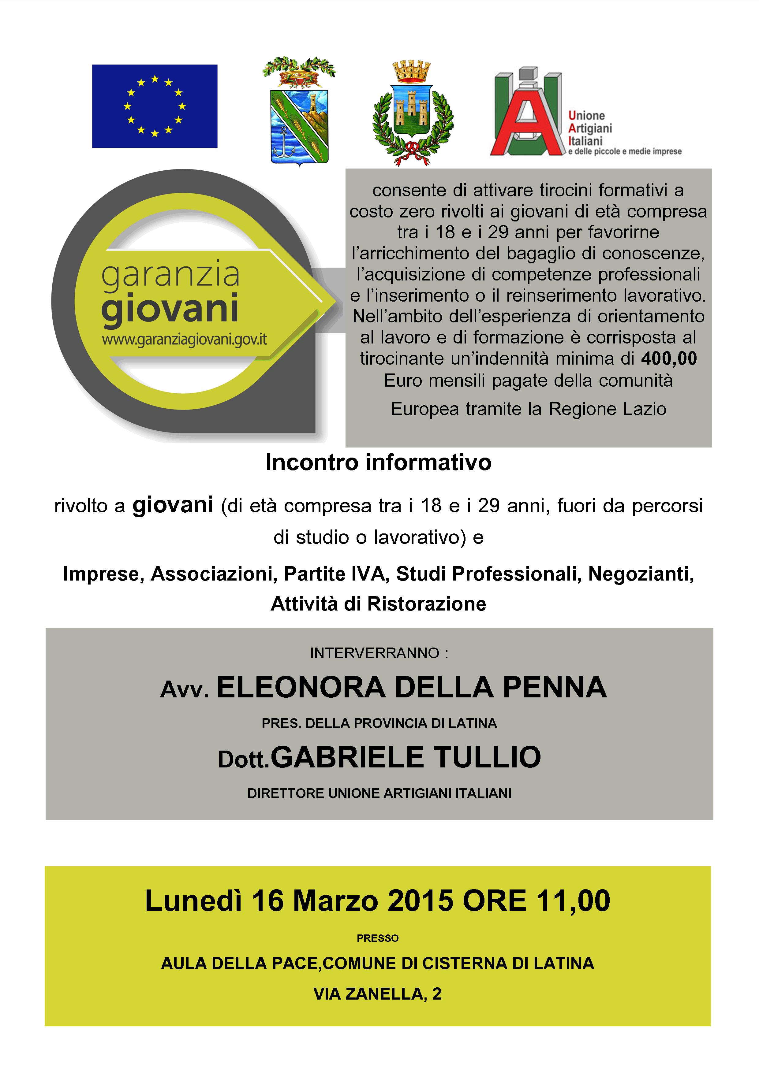 “Garanzia Giovani”: lunedì 16 marzo a Cisterna l’incontro informativo