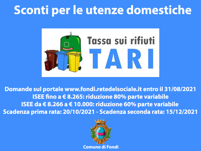 FONDI, Tari: confermate le riduzioni per persone con invalidità e nuclei in stato di disagio economico